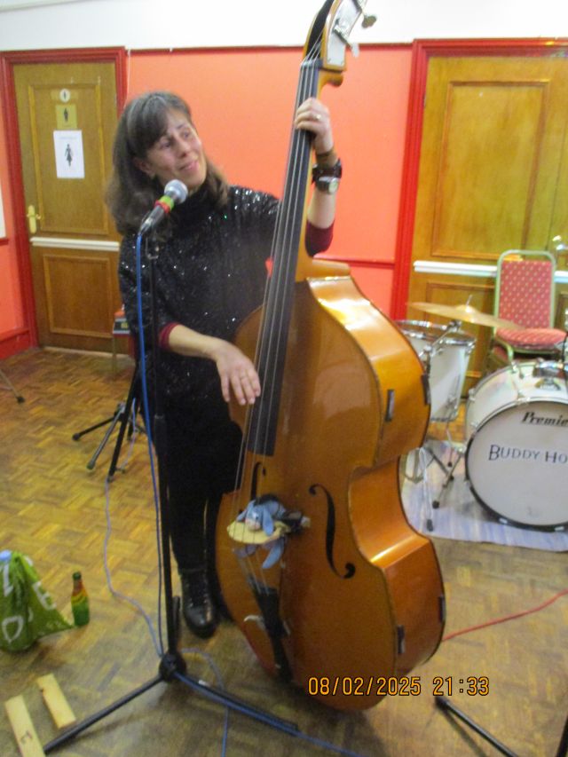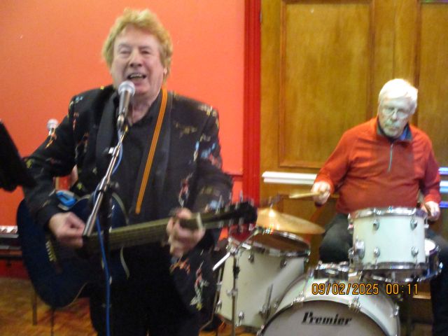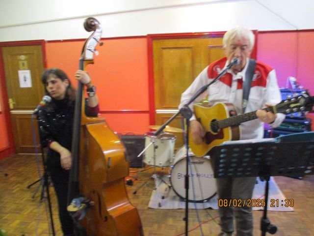 The Rob family started the evening with their debut performance as a Buddy Holly tribute band and wowed the audience with their repertoire. Tommy amazed everyone by playing his new drumkit (a present for his 9th birthday on the previous day). They were followed by the Trevor Hyett trio who managed to slip in 'Tears on my Burgers ' which although not Buddy or 50s had been specially requested. Dave Forster followed with his backing band which had somehow expanded and took over the whole stage. Ron Trueman-Border performed a song specially written by him as a tribute to Buddy. The Feuding Lloyds once again recreated the spirit of Buddy Holly with the help of guest musician Mark Hankins
