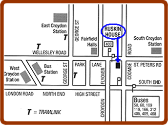 Parking: Ruskin House is just on the edge of Croydon's Super-Heavy Manners Parking Zone, which operates every day until midnight. Less stringent parking restrictions operate south of Coombe Road. If you do drive to Ruskin House, please park considerately in the surrounding area and leave as quietly as you can. | |